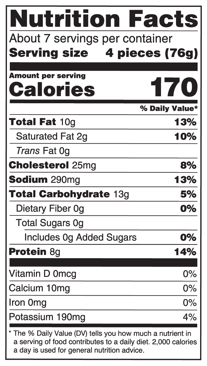 Conventional oven425°F / 10 - 12 minutesPreheat oven to 425°F. Place a single layer of product on a baking sheet. Heat in center of oven for 10 to 12 minutes. Turn product over halfway through heating time.Air Fryer400°F / 6 - 7 minutesPlace frozen pieces in a single layer in the basket. No need to preheat. Heat at 400°F for 6 to 7 minutes.Microwave1 1/2 - 2 minutesPlace frozen pieces on a microwave safe plate. Heat on high power for 1 1/2 - 2 minutes. Turn product over halfway through heating time. Let stand 1 minute before serving.Convection Oven350°F / 5 - 7 minutesPreheat oven at 350 degree F. Place a single layer of product on a baking sheet. Heat for 5 to 7 minutes. Turn product over halfway through heating time.Toaster Oven425°F / 11-13 minutesPreheat oven to 425 degrees F. Place a single layer of product on a baking sheet. Heat for 11 to 13 minutes. Turn product over halfway through heating time.Fryer350°F / 1½ - 2½ minutesPreheat oil to 350°F. Fry for 1½ to 2½ minutes.
