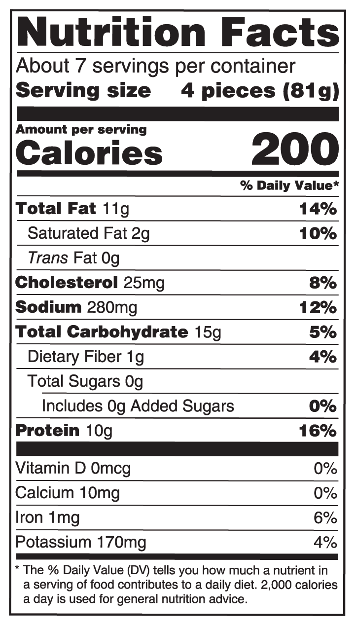 Conventional oven425°F / 10 - 12 minutesPreheat oven to 425°F. Place a single layer of product on a baking sheet. Heat in center of oven for 10 to 12 minutes. Turn product over halfway through heating time.Air Fryer400°F / 6 - 7 minutesPlace frozen pieces in a single layer in the basket. No need to preheat. Heat at 400°F for 6 to 7 minutes.Microwave1 1/2 - 2 minutesPlace frozen pieces on a microwave safe plate. Heat on high power for 1 1/2 - 2 minutes. Turn product over halfway through heating time. Let stand 1 minute before serving.Toaster Oven425°F / 11 - 13 minutesPreheat oven to 425°F. Place a single layer of product on a baking sheet. Heat for 11 to 13 minutes. Turn product over halfway through heating time.Convection Oven350°F / 5 - 7 minutesPreheat oven at 350°F. Place a single layer of product on a baking sheet. Heat for 5 to 7 minutes. Turn product over halfway through heating time.Fryer350°F / 1½ - 2½ minutesPreheat oil to 350°F. Fry for 1½ to 2½ minutes.